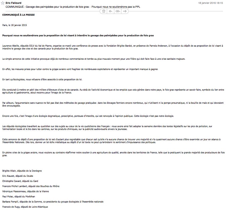 nous voulons au contraire réaffirmer notre soutien à une agriculture de qualité (...) telle que la pratiquent la grande majorité des producteurs de foie gras.