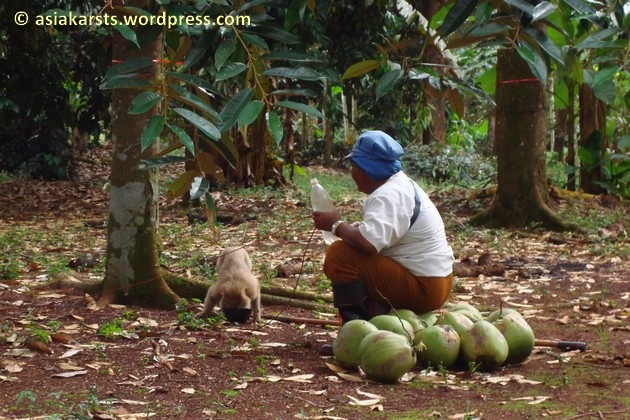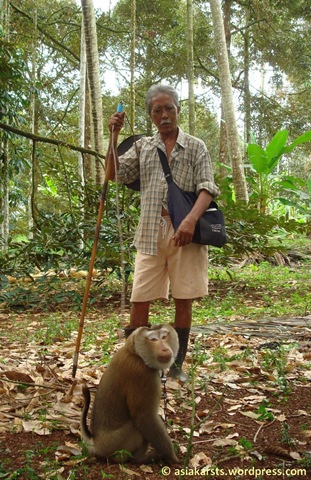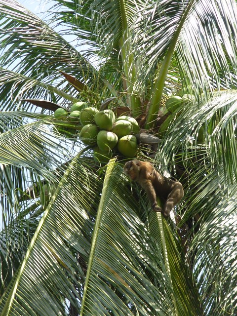 Ces singes sont des macaques à queue de cochon, ils sont attaché en permanence en laisse avec une corde très longue et grimpent au sommet du palmier avant de cueillir les noix de coco mûres(ils font la différence entre les mûres et les pas mûres) en les faisant tourner sur elles-mêmes (à l'aide des pieds et des mains) jusqu'à rompre la tige et laisse ensuite tomber la noix de coco au sol.